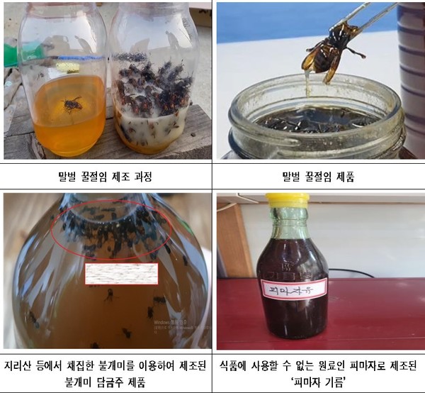 이번에 적발된 업자들은 ‘말벌 무료 퇴치’ 라는 개인 블로그 등을 운영하면서 말벌을 제거해달라는 신고가 들어오면 신고된 장소를 직접 방문하여 말벌을 채집하거나 지리산 인근 등에서 불개미를 채집하는 등 식품에 사용할 수 없는 원료를 채집해 즉석판매제조‧가공업 신고 없이 담금주와 꿀절임을 제조했다. 또한 제조된 제품을 고혈압, 뇌졸중, 당뇨병, 관절염 치료 등의 효능‧효과가 있는 것으로 부당 광고하여 소비자와 지인 등에게 약 2600만원 상당을 판매한 것으로 드러났다.