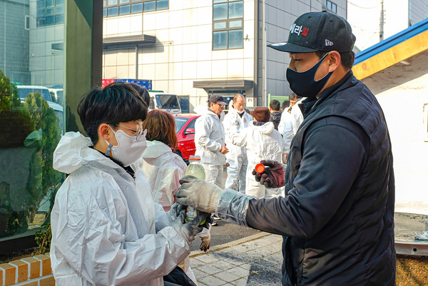 [뉴스인] 민경찬 기자 = 미국 프로야구(MLB) 탬파베이 레이스의 최지만 선수(왼쪽)가 11일 인천시 동구에 연탄 2500장을 기증한 후 송림동에서 지역 봉사단 '동네방네 가족봉사단'과 연탄을 배달하던 중 봉사단의 김진원(동산중1) 군에게 음료수를 권하고 있다.