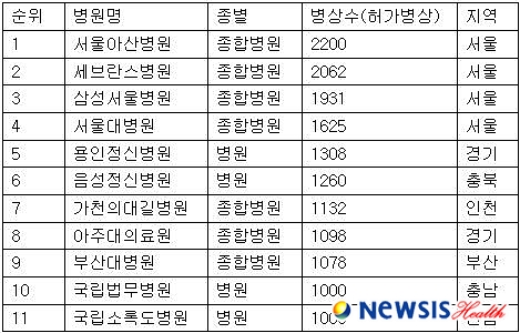 용인정신병원(1308병상), 음성정신병원(1260병상), 가천의대길병원(1132병상), 아주대의료원(1098병상), 부산대병원(1078병상), 국립법무병원(1000병상), 국립소록도병원(1000병상)도 1000병상 이상을 보유한 병원으로 기록됐다.
