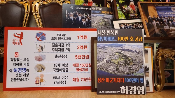허 후보는 "현행 국회의원 수 300명을 100명으로 대폭 축소하고 각종 특혜를 폐지하며 무보수 명예직으로 할 것"이라며 "당리당략과 사리사욕으로 국가 비전과 민생 대책을 외면하고 국민들을 피눈물을 흘리게 한 국회의원들을 정신교육대에 보낸다"고 덧붙였다.