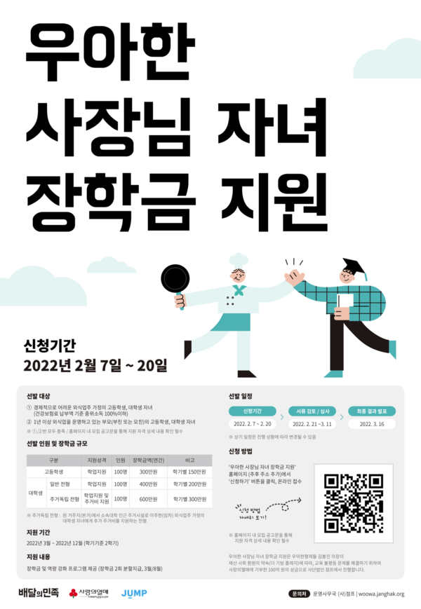 [뉴스인] 김은영 기자 =사랑의열매 사회복지공동모금회(회장 조흥식)가 사단법인 점프(대표 이의헌)와 경제적 어려움을 겪는 외식업주 자녀에게 ‘우아한 사장님 자녀 장학금 지원’을 위한 장학생을 모집한다고 밝혔다.