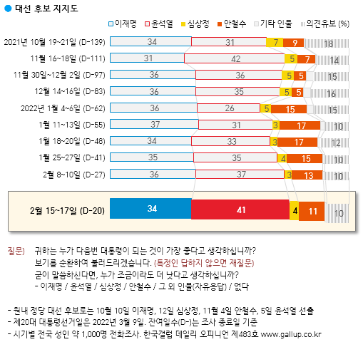 [뉴스인] 김태엽 기자 =2022년 2월 15~17일 전국 만 18세 이상 유권자 1,007명에게 누가 다음번 대통령이 되는 것이 가장 좋다고 생각하는지 물었다(보기 순서 로테이션). 그 결과 윤석열 41%, 이재명 34%, 안철수 11%, 심상정 4%, 그 외 인물 1%로 나타났고, 유권자 중 10%는 의견을 유보했다. 지난주와 비교하면 이재명과 안철수가 각각 2%포인트 하락했고, 윤석열은 4%포인트 상승해 양강 백중세에서 격차가 벌어졌다.