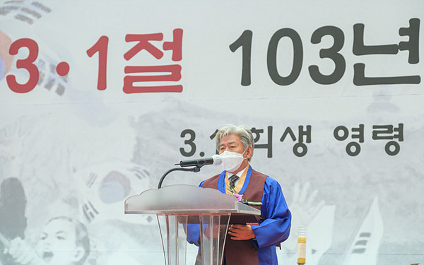 [뉴스인] 민경찬 기자 = 1일 오후 서울 종로구 천도교 중앙총부 광장 특설무대에서 3.1절 103주년 기념 민족공동행사 3.1 희생 영령 국민추모제와 기념식이 열려 대회장인 송범두 천도교 교령이 기념식 대회사를 하고 있다.