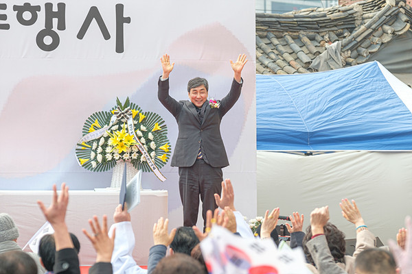[뉴스인] 민경찬 기자 = 1일 오후 서울 종로구 천도교 중앙총부 광장 특설무대에서 3.1절 103주년 기념 민족공동행사 3.1 희생 영령 국민추모제와 기념식이 열려 이종걸 민족화해협력범국민협의회 대표상임의장이 기념식 축사 후 참석자들과 만세를 외치고 있다.