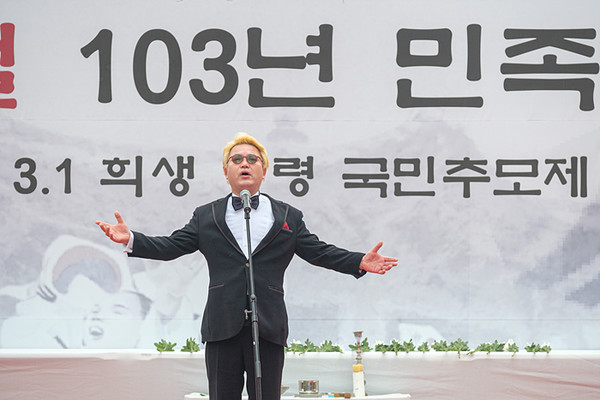 [뉴스인] 민경찬 기자 = 1일 오후 서울 종로구 천도교 중앙총부 광장 특설무대에서 3.1절 103주년 기념 민족공동행사 3.1 희생 영령 국민추모제와 기념식이 열려 테너 하만택 교수가 기념식 축가로 '내 영혼 바람되어'를 연주하고 있다.
