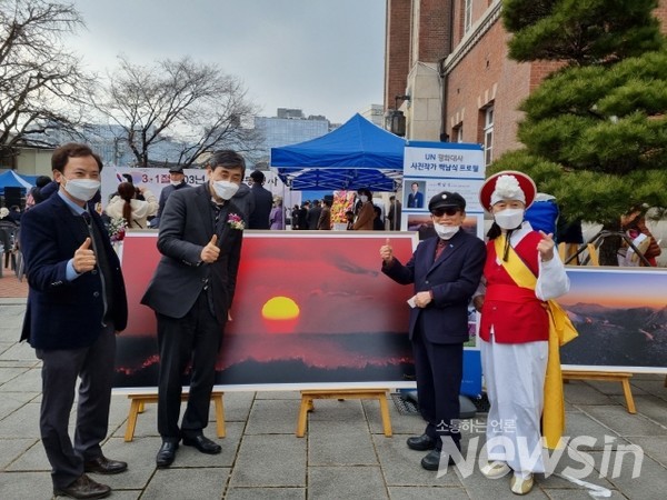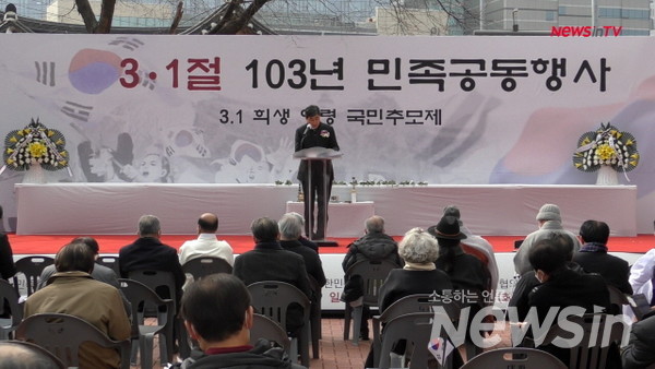 [뉴스인] 김기현 기자 = 지난 1일 오후 서울 종로구 천도교 중앙총부 광장 특설무대에서 3.1절 103주년 기념 민족공동행사 3.1기념식 및 희생 영령 국민추모제가 열렸다. 이 날 2부 기념식에서 이종걸 민족화해협력범국민협의회 대표 상임의장이 축사를 하고 있다.